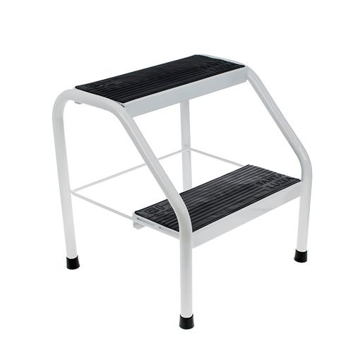 ESCADA COM 2 DEGRAUS, Armação em tubos redondos de 3/4″ com pintura epoxi, reforçada, degraus revestidos com material sintético antiderrapante, pés com ponteiras de PVC.